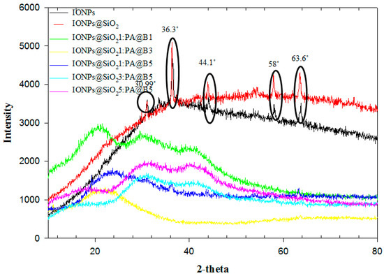 The XRD analysis results of the synthesized composite materials are given in Figure 5. The data from the graph show us that the IONPs have some sharp peaks that confirm their crystalline structure. Moreover, the crystalline form of the nanoparticles is confirmed by the sharp peaks at 30.99°, 36.3°, 44.1°, 58°, and 63.6° [46]. The graph of the IONPs@SiO2 also shows similar peaks that ensures its crystalline nature, with no loss of any of the entity. This shows that after coating of of silica on the IONPs, the crystalline structure of the nanoparticles was not disturbed, and showed the peaks in the similar range. By incorporation of the core–shell latex with IONPs@SiO2, the intensity of these peaks decreased and became very low, ensuring their combination. However, due to the presence of the IONPs@SiO2, the peaks are still present with low intensity, confirming the presence of both the PA@B and IONPs@SiO2.