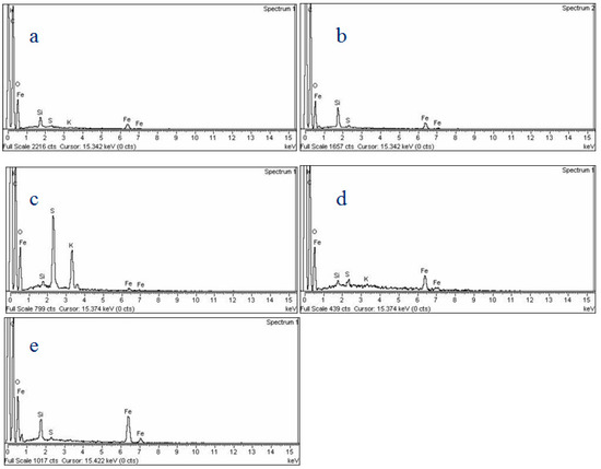 Figure 7 shows the EDX analysis of the synthesized IONPs. The incorporation of silica with the IONPs is confirmed by the presence of its peaks in Figure 7a. Moreover, the presence of the peaks for carbon and sulfur also shows the presence of the core–shell latex linked with IONPs@SiO2. The presence of peaks for Fe confirms the magnetic nature of all of the prepared MCM-PA@B (Figure 7).