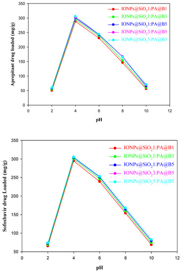 As previously shown in Figure 4, the synthesized composite materials have a pHzpc of 2.5. Above this pH, MCM-PA@B has positive charge, while below this pH it has negative charge. According to Bedi et al. [49], aprepitant has a pKa value of 9.7, while Sofosbuvir has a pKa value of 9.3 [50]. These pKa values show that both drugs are in an anionic form below pH 9. Maximum loading of the drugs was found to be 307 mg/g for aprepitant and 306 mg/g for sofosbuvir at pH 4 due to the presence of opposite charges on the drugs and composite materials. The loading capacity decreases as the pH is increased from 4 to 10, due to conversion of the drugs to a cationic form, which causes repulsion at higher pH. The lesser amount of drug loading is attributed to the free space available for the accommodation of drug molecules.