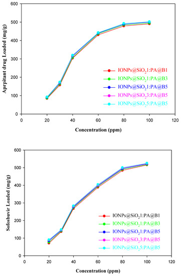 The loading of both drugs was also studied for different concentrations of the drugs. From Figure 10 (upper), it can be observed that the loading of aprepitant reached a maximum of 490 mg/g for composite materials with a lower quantity of core–shells and 501 mg/g for composites with higher quantities of PA@B. The increase in the loading of the drug occurred until 80 ppm, and then there was no significant change in the loading amount of the drug. The loading of sofosbuvir increased to maximum values of 515 mg/g for composite materials with lower quantities of core–shells and 525 mg/g for composites with higher quantities of core–shell latex. The loading of sofosbuvir into the composite materials is given in Figure 10 (lower).