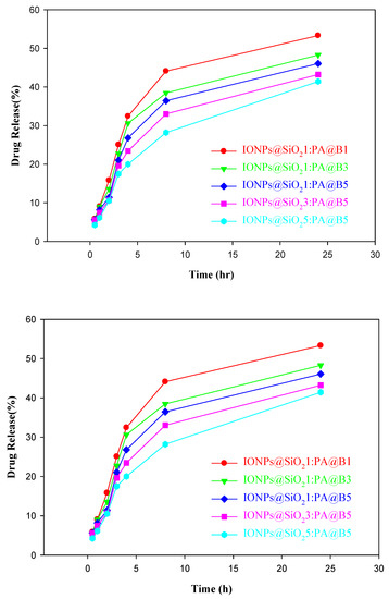 Magnetic nanoparticles have recently been synthesized and applied in a large number of fields, including loading and controlled release of drugs, separation of cells, enhancing magnetic resonance imaging, the treatment of cancer, and many more [1]. Nanoparticles based on iron oxide are chemically stable, easily diffusible, less toxic, and biocompatible, due to which they are highly significant [2]. The use of bare iron oxide nanoparticles has problems of low accumulation, low separation yield by magnets, and the possibility that their atoms may oxidize, decreasing the properties of dispersion and magnetism [3]. The property of having a high surface-to-volume ratio of iron oxide nanoparticles provides room for the adsorption of plasma proteins, followed by the activation of clearance mechanisms before they reach the target site. The time for the circulation of nanoparticles and decrease in the risk of adsorption of plasma proteins is also enhanced by the modification of the surface with some biocompatible polymers with a hydrophilic nature [4,5]. Iron oxide nanoparticles are mostly encapsulated by the silica, because it is inert and has ease of functionalization, and after encapsulation these nanoparticles become water-compatible [6,7]. The use of bare magnetic nanoparticles is usually prohibited for the application of drug delivery, because of the compromised biocompatibility and they do not possess various functionalities facilitating the coating of polymers on their surfaces. For this reason, they are coated with silica so that their surfaces are ready for coating and enhanced interaction with drugs [8,9,10].