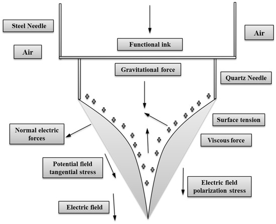 The Taylor–Melcher leaky dielectric model underpins the phase field approach. At the needle apex, the influence of different forces was detected. The Navier–Stokes equation, which is provided in Equation (2), was used to construct the balance of boundary conditions such as electrostatic and hydrodynamic fields [30].
