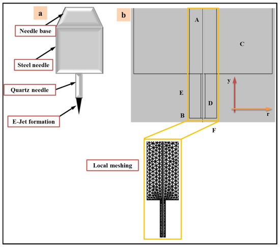 COMSOL multi-physics software was used to simulate the cone-jet and micro-drip regimes. The combined needle system was created to validate the experimental design for the micro-fabrication process. The 2D axisymmetric drawing was primarily generated to build an accurate model to pursue suitable simulation results, as illustrated in Figure 2. The geometry of the combined needle created in this simulation model is shown in Figure 2a. Similarly, Figure 2b depicts the model’s boundary conditions and tighter, user-controlled meshing, which can have a considerable influence on simulation fidelity. To execute the E-Jet printing model in the phase field domain, an axisymmetric geometry was created. As can be observed, the cone-jet regime in E-Jet technology involves significant electrostatic physics, which influence the charge density distribution around the combined needle. The findings were achieved at the optimal settings, where a series of simulation tests were carried out to determine the appropriate parameters for two distinct functional inks of UF 3808 and SEMICOSIL988/1K. The simulation study focuses on the regime transitions at different time intervals of a two-phase interface. Table 1 assumes and defines the boundary conditions of the electric charge field and the two fluid fields. Furthermore, the functional restrictions of liquid interfacial tension and air pressure applied to the steel needle during the cone-jet production phase had a significant influence, lowering the diameter of the jet to become even smaller than the inner diameter of a needle.