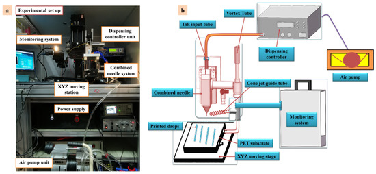 The (a) experimental setup (b) schematic diagram of the E-Jet printing process.