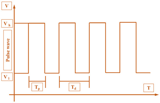 The DC positive pulse voltage was selected and periodic electric field force was applied to control the formation and interruption of the E-Jet flow, to realize the DoD printing of droplet patterns on the flexible substrate. Figure 6 is a schematic diagram of the pulse waveform, where Vh represents the high-voltage pulse, Vl represents the low-voltage pulse, and the difference between Vh and Vl represents the voltage amplitude. In one cycle, the ratio of the bandwidth Tp of a high-voltage pulse to the total period Td of the pulse voltage is called a duty cycle. Further, the reciprocal of a pulse voltage period, Td, is called the pulse frequency f, which represents the number of times the high-voltage pulse signal is generated per unit time. Similarly, it directly disturbs the resolution and density of the micro-structures formed during the entire process. Among them, the choice of a high-voltage pulse should ensure that the end of the spray needle produces a stable micro-dripping mode or cone jet mode. The choice of a low-pressure pulse should ensure that the end of the spray needle can form a Taylor cone profile but does not produce a cone-jet. The use of pulsed electrical signals can reduce the charge of the flexible insulating substrate. Therefore, the effect of residual charges on the stability of the cone-jet and micro-droplets are considerably reduced.
