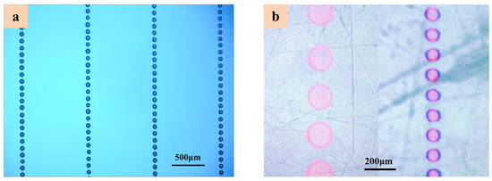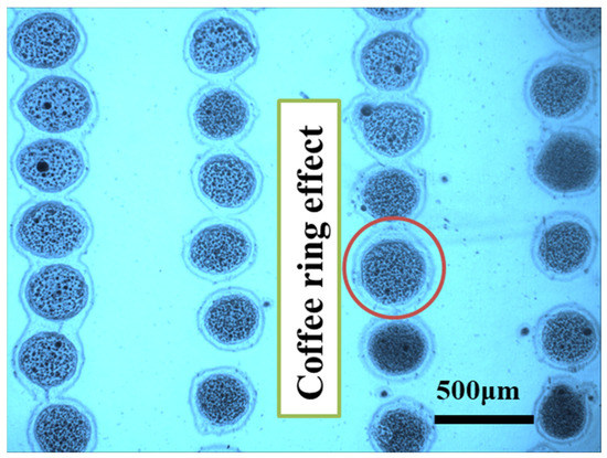 This work uses SEMICOSIL988/1K and UF3808, two different types of functional inks, to print printing micro-droplets and linear patterns on the flexible substrates. The optimized process parameters are properly adjusted to integrate the electrofluid jet for the stable droplets’ morphologies. The printing control monitoring camera performs linkage control for various parameters, such as motion, pressure, voltages, and flexible insulating substrates. The micro-droplets of different sizes were printed on the flexible PET substrates with the execution of DoD E-Jet printing process as shown in Figure 8. Moreover, Figure 8a displays the different variations of several droplets in terms of their sizes that were printed in the form of array using functional ink of SEMICOSIL988/1K. The minimum droplet diameter was measured at 104 μm on the PET substrate surface. Similarly, Figure 8b shows micro-droplets being printed and the droplet diameter was measured at 85 μm. The DoD printing of droplets shows that the size of droplet is not irregular, which leads to high quality and efficient printing during the production of overhanging structures with a specific ink. The droplet morphology allows for the suppression of the adhesive flexible structure in the electronic packaging process, which avoids the coffee stain effect on droplet morphology. Due to this phenomenon, the droplet morphology does not contradict the highly insulating properties of a PET substrate and the formed structure is orderly and controllable.