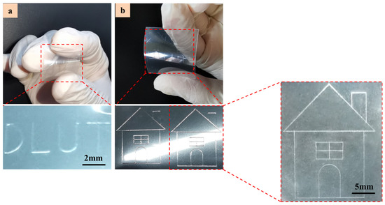 The printing of linear patterns on flexible PET substrates using functional liquid of UF3808 (a) “DLUT” pattern (b) “Little house” pattern.