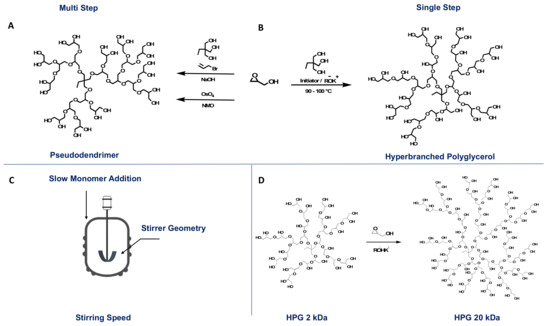 Top: (A) Pseudodendrimer, (B) HPG. Bottom: (C) reaction parameters, (D) (macromonomer, multistep).
