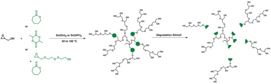 Synthesis of degradable HPG via coordination–insertion mechanism. The degradation follows different stimuli such as changes in pH, reductive environment, etc.