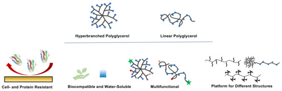 - Thomas, A.; Müller, S.S.; Frey, H. Beyond Poly(ethylene glycol): Linear Polyglycerol as a Multifunctional Polyether for Biomedical and Pharmaceutical Applications. Biomacromolecules 2014, 15, 1935–1954. [Google Scholar] [CrossRef]