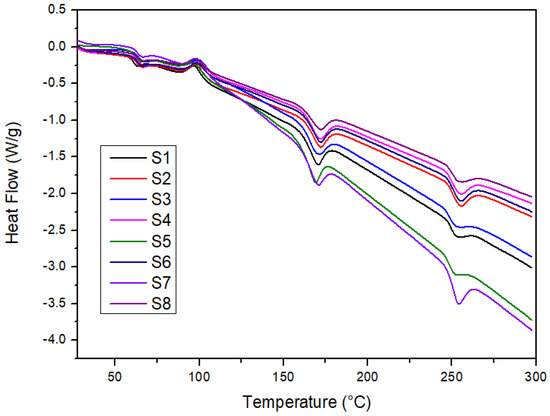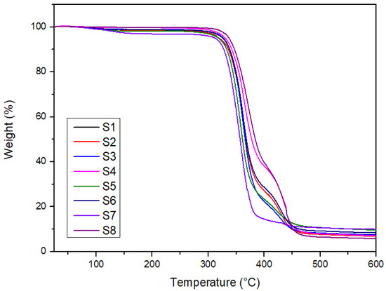 | Code | T5% (wt.%) | Tmax1 (°C) | Tmax2 (°C) | Tmaxt3 (°C) | Residue (wt.%) | |