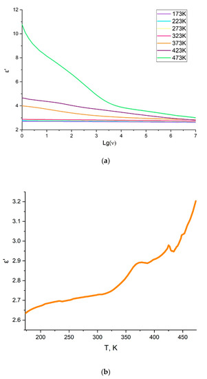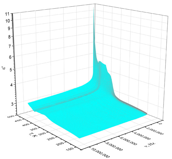In Figure 7, the dependence of ε′ for polyNBi on the temperature and the frequency of the electric field is presented as a 3D plot. It can be seen that the temperature and frequency influence on the dielectric permittivity is weakly expressed at temperatures below Tg and at low frequencies. Therefore, this range of temperatures and frequencies is the most suitable for a potential application of polyNBi as a dielectric material. At the same time, the dielectric relaxation strength (Δε′) for polyNBi was approximately 8.0 at temperatures above Tg and at low frequencies.