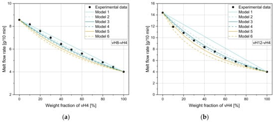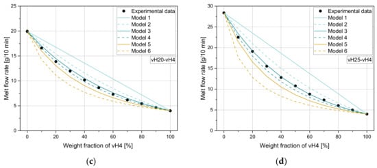 Figure 2a–d compare the experimental MFR values for all homopolymer blends with the calculated values according to the mixing rules in Table 4. For all blends, the measured values lie mostly between the predicted results according to model 3 and model 4, where model 3 overestimates and model 4 underestimates the measured MFR values. However, these two mixing rules show the best fit independent of the weight fraction of vH4. For small MFR differences (e.g., vH8-vH4), all mixing rules seem to be applicable (see Figure 2a), while for large MFR differences model 1 and model 6 lead to larger errors. These two mixing rules are quite accurate for very small weight fractions of vH4, while in the middle of the curves with weight fractions of around 50% of vH4, the deviations are more pronounced. Models 2 and 5 show a slightly worse performance for all investigated mixtures compared to model 3 and 4. In general, models 1 to 3 overestimate the experimental MFRs, while models 4 to 6 underestimate the experimental values.
