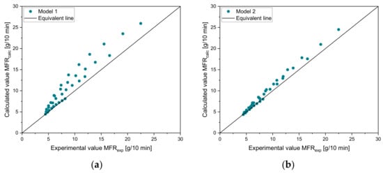 Our modeling approach provided an analytical regression (MTF model) for the MFR of the mixture, where to are the subfunctions, which contain 13 coefficients. The subfunctions and their coefficients are given in Appendix A. The model includes only basic arithmetical operations and the natural logarithm. The applicability range of the model is restricted to the following MVR ranges of the mixing partners: (i) g/10 min and (ii) g/10 min.