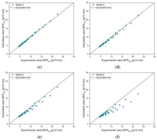 To demonstrate the performance of the regression model, Figure 10a–d show a comparison of experimental and calculated MVR values for selected mixtures including homopolymers and recyclates. In addition, the results according to the models 3 and 4 are included. For all combinations, the MTF model outperforms the accuracy of the reference models, as additionally demonstrated in Table 9, which indicates the , (ii) the , and (iii) for the selected points.