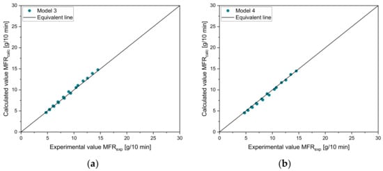 Parity plots for comparison of experimental and calculated values of commercial recyclates for (a) model 3 and (b) model 4.