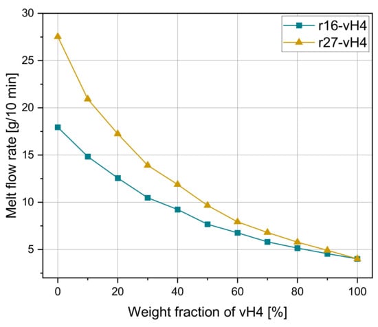 Melt flow rate depending on the weight fraction of vH4 of recyclate blends r16-vH4 and r27-vH4.