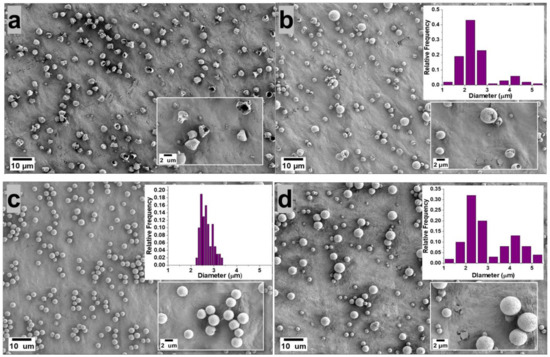 On the other hand, microparticles sprayed from (DMF/ACE 40:60 v/v) solution exhibited a predominantly hollow microsphere structure; this can be attributed to the introduction of more DMF and the reduced ACE solvent, which slows down the evaporation rate of the co-solvents, thus giving the polymer chains sufficient time to homogenize during flight time of the droplet to the collector. However, this solvent ratio is not optimized enough to form microparticles with dense spherical structures.