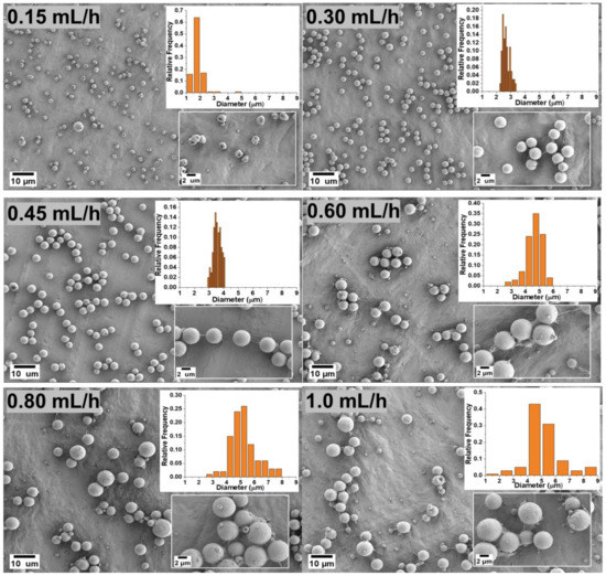 Electrospray was conducted by applying a voltage of 8.5 kV with an ES50P-20W HV power supply from Gamma High Voltage Research, the electrosprayed solution was emitted from a steel needle with an inner diameter of 22 gauge. A syringe pump was used to feed the polymer solution using various flow rates of 0.15, 0.3, 0.45, 0.6, 0.8, and 1.0 mL/h. The electrosprayed particles were collected on aluminum foil and placed on the grounded collecting plate at 18.5 cm from the needle tip. Experiments were conducted under ambient conditions of relative humidity ranging between 70–75% and temperatures of 17–18 °C.