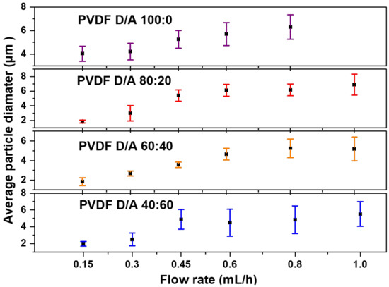 Average PVDF microparticle size distribution of electrosprayed samples varying the flow rate and DMF/ACE solvent ratios.