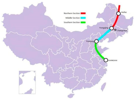 The China–Russia Eastern trunk line starts from the China–Russia border in Heihe City, Heilongjiang Province, runs through Heilongjiang, Jilin, Inner Mongolia, Liaoning and Heilongjiang, Beijing, Tianjin, Shandong, Jiangsu, Shanghai, and ends at Baihe End Station in Shanghai, with a total length of 3334.6 km []. The design output is 380 × 108 m3/a, the design pressure is 12 MPa/10 MPa, and the pipe diameter is 1422 mm/1219 mm/101.6 mm. According to the overall direction of the route, the China–Russia East Route pipeline crosses the Yangtze River in Nantong Economic and Technological Development Zone and Changshu Economic and Technological Development Zone in Jiangsu Province, via the shield tunnel, which is the control project of the China–Russia East Route. The Yangtze River shield tunnel is huge, with a horizontal length of 10,324 m. The horizontal length of the shield tunnel crossing is 10226 m (north bank shaft center to south bank shaft center), as shown in Figure 1. According to the preliminary design scheme of the project, there are plans to fill the tunnel with foamed concrete after the installation of pipes, as shown in Figure 2.
