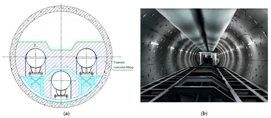 Schematic diagram of foamed concrete tunnel filling: (a) sectional structure diagram; (b) diagram of the tunnel interior.