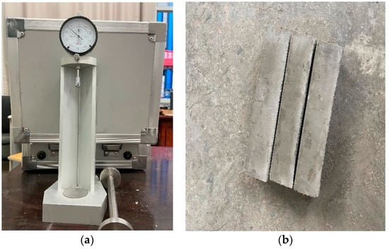 - The specimens were demolded after 24 h and placed in a curing box, with constant temperature and humidity control. The shrinkage of each specimen was measured after curing for different times, according to the test scheme. The test instrument and specimen are shown in Figure 4.