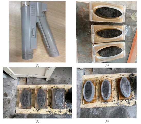 - The mixed foamed concrete was cast into an elliptical mold (inner size 210 mm × 90 mm × 45 mm, outer size 250 mm × 130 mm × 45 mm) and placed in a standard curing laboratory for curing.