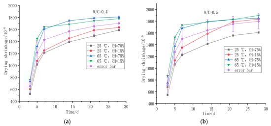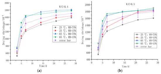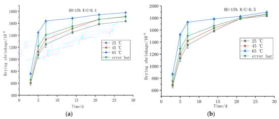 Drying shrinkage of foamed concrete under different curing temperatures (RH = 15%): (a) 0.4 water–cement ratio dry shrinkage of foamed concrete; (b) 0.5 water–cement ratio dry shrinkage of foamed concrete.