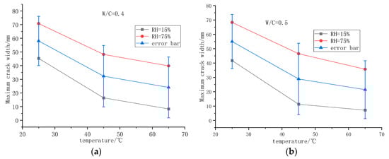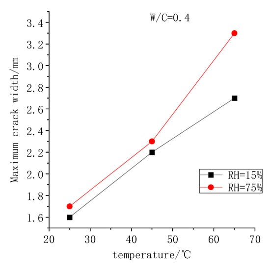 As shown in Figure 11, with the increase in temperature, the maximum crack width of foamed concrete presents an increasing trend. At relative humidity of 75%, the maximum crack width increases linearly from 1.1 mm to 2.7 mm when the temperature increases from 25 to 65 °C. The crack width expands further when the ambient humidity is lowered to 15%. At the temperature of 65 °C and relative humidity of 15%, the maximum crack width reaches 3.3 mm.