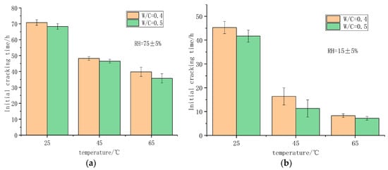 Initial cracking time of foamed concrete with different water–cement ratios: (a) RH = 75% initial cracking time of foamed concrete; (b) RH = 15% initial cracking time of foamed concrete.