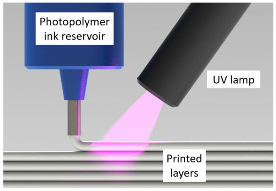 Schematic depicting the UV-DIW printing process, in which a photopolymer ink is deposited and rapidly cured in situ.