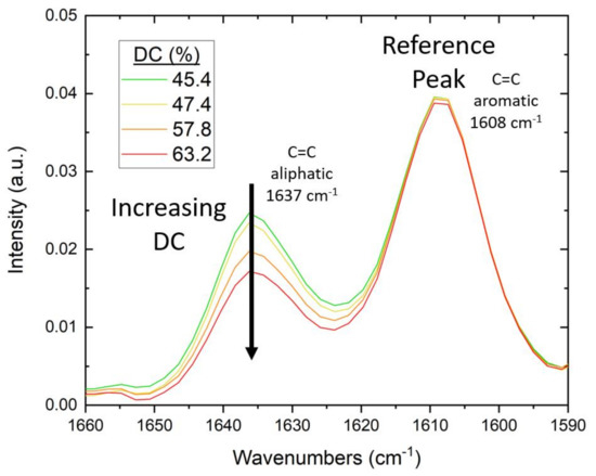 Example of change in FTIR spectra with increasing DC of Bis-EMA photopolymers. As the (meth)acrylate pendant groups react during curing, the intensity of the aliphatic C=C peak at 1637 cm−1 decreases.