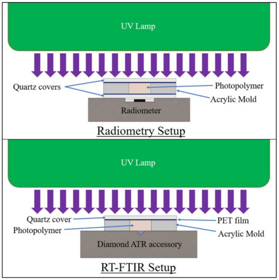 For comparison against pulse-irradiation testing, an additional FTIR measurement was taken at 10 min post-irradiation for each specimen. This measurement consisted of 64 scans at 4 cm−1 resolution, which were averaged into a single spectrum. A minimum of three specimens of each formula were tested for both radiometry and RT-FTIR, with the specimen setup shown in Figure 4.