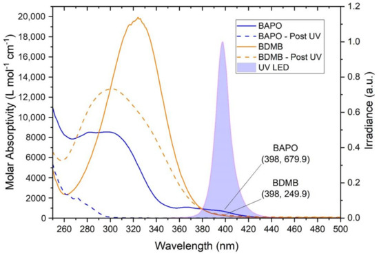 The molar absorptivity of BAPO and BDMB, with the reaction byproduct molar absorptivity indicated by ‘Post UV.’ The absorptivity is compared with the spectral output of an Altair 75 lamp, with the measured spectral output indicating a peak UV output at 398 nm.