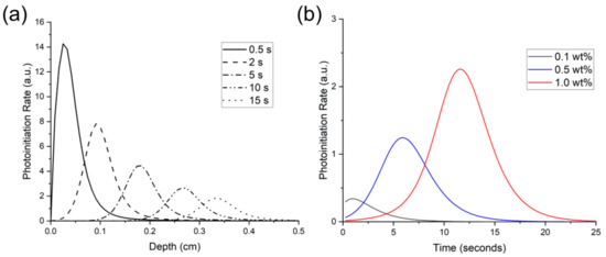 Figure 6a shows the theoretical photoinitiation rates for BAPO at the 1.0 wt% concentration. Note that the peak photoinitiation rate shifted over a 10 s period from a 0.5-mm depth at 0.5 s to a 4.7-mm depth, indicating an initiation wavefront due to photobleaching. The peak initiation rate occurred closest to the irradiated surface, and as photoinitiation progressed into the polymer, the peak rate also decreased. Kenning reported this same trend for BAPO at 0.0268 mol/L concentration and a 93 mW/cm2 light intensity, with falling peak-initiation rates at increasing time and depth [49].