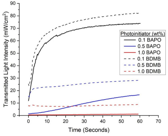With continuous irradiation of 380 mW/cm2 for 60 s, the measured transmitted-light intensity increased with time for BAPO and the BDMB control formulations. As shown in Figure 7, the formulations with the 0.1 wt% PI concentration allowed greater light transmission than the higher tested concentration levels. The BDMB control formulations also consistently allowed more light transmission than BAPO formulations at the same wt% concentration. For the BAPO formulations, the highest transmitted-light intensity at 60 s is 74.0 mW/cm2, only 19% light transmission. The peak transmitted-light intensity for the baseline Bis-EMA:PETIA without any PI was 136 mW/cm2, or 36% light transmission (see Figure S3). These findings indicate that complete photobleaching had not occurred by 60 s of irradiation even at 0.1 wt% BAPO.