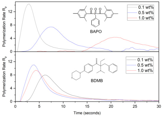 The polymerization rate in Figure 8 clearly distinguishes the curing behavior of BAPO formulations and the BDMB control. As was predicted by the optical model in Figure 6b, higher concentrations of BAPO resulted in a delayed onset of the peak polymerization rate. The BDMB-control formulations exhibited a less-consistent delay, with the slowest start of polymerization for the lowest concentration of 0.1 wt%. This delay confirms the influence of photobleaching on BAPO-curing behavior during continuous irradiation and the presence of an initiation wavefront created by free-radical generation in response to changing light penetration over time. However, the delay in cure observed by RT-FTIR is higher than the delay in photoinitiation predicted by the optical model. For the 1.0 wt% concentration of BAPO, peak polymerization rate occurred after 20 s, while the optical model predicted peak photoinitiation at 6 s. Most notably, the trend in polymerization rate (see Figure 8) versus predicted photoinitiation rate (see Figure 6b) is the opposite, with the polymerization rate peak decreasing as the PI concentration increases.