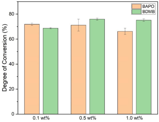 As shown in Figure 9, the ultimate DC for each photopolymer formulation was measured 10 min after 60 s of UV irradiation. The average DC was calculated with a minimum of three specimens per formulation. All formulas achieved an average bottom-surface DC ranging between 66% and 76%.