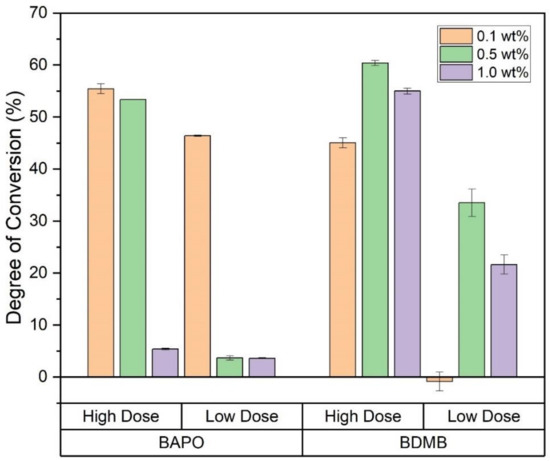 The present study focused on BAPO as a photobleaching PI to improve the cure response of Bis-EMA in 3-mm-thick layers. Formulations with PI concentrations of 0.1 wt%, 0.5 wt%, and 1.0 wt% were cured under a high-intensity UV LED lamp with a short irradiation time (<5.0 s), simulating the conditions expected of a large-format UV-DIW 3D printer. For a constant UV dose, the authors hypothesized that the level of cure at a 3-mm depth would improve at BAPO concentrations of 0.5 wt% or lower. For the same PI concentration, BAPO formulations were also predicted to achieve a higher degree of cure at a 3-mm depth than non-photobleaching BDMB control formulations.