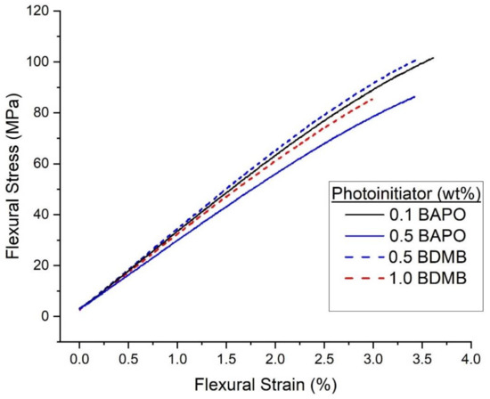 Two BAPO formulations and two BDMB formulations were selected for further mechanical testing based on FTIR results. Flexural specimens were prepared with nominal dimensions: 12.7 mm width × 3 mm depth × 58 mm length. Specimens were cured in white acrylic molds at 3.7 s pulse irradiation at 1600 mW/cm2 incident-light intensity, with PET film and 1-mm-thick glass-microscope slides on top and bottom. Three-point bend testing was conducted per ASTM D790, with six specimens tested per formula and a 16:1 span-to-depth ratio.