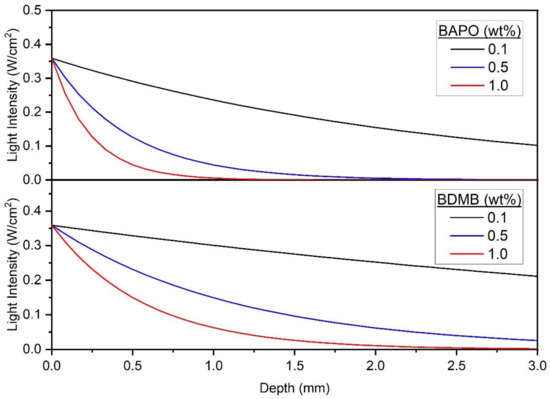 Utilizing Equations (2), (5)–(7) and (12), the model was solved for BAPO at 0.1 wt%, 0.5 wt%, and 1.0 wt%, which are equivalent to molar concentrations of 0.00267 mol/L, 0.01329 mol/L, and 0.02645 mol/L, respectively. A continuous, constant UV irradiation was assumed, with an intensity output matching the Altair 75 lamp, at a peak irradiation of 380 mW/cm2.