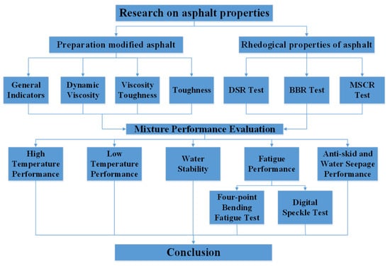 As of early 2022, total highway mileage had reached 5.2807 million kilometers in China, of which maintenance mileage accounted for 99.4%, so the task of road maintenance is arduous []. To reduce road damage, increase the service life of road surfaces, reduce road surface overhaul, and save resources, it is of great eco-environmental value and engineering application significance to build ultra-thin overlays to maintain pavement in response to the national “double carbon” policy. In the 1990s, ultra-thin overlays began to be used in preventive maintenance technology for asphalt pavement, and the overlay thickness was reduced to 15–20 mm []. The reduction in thickness resulted in problems such as quick aging, poor durability, and poor water stability of the pavement [,,]. In order to prolong the life cycle of ultra-thin overlays, it is recommended to use high-viscosity modified asphalt to improve its road performance. Therefore, the improvement of modified asphalt viscosity and mixture performance has been studied by many scholars [,,].