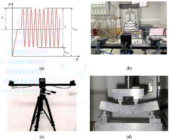 Bending fatigue test. (a) Load waveform; (b) Experimental procedure; (c) DIC equipment; (d) Bending state of the specimen.