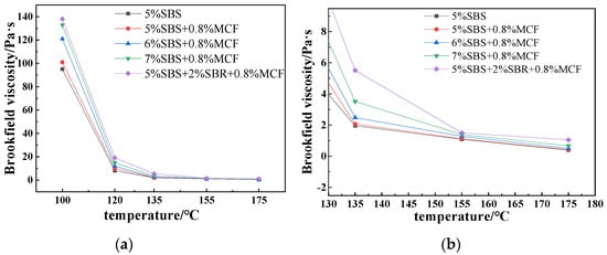 Rotational viscosity test results for the modified asphalts. (a) 100–175 °C temperature range; (b) 130–175 °C temperature range.