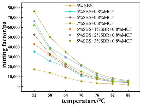 A temperature sweep test was carried out on the modified asphalt, 52–88 °C as test temperature range, the temperature increase rate was 2 °C/min, the fixed strain was 0.5%, and the frequency was 1 HZ. The variation laws of rutting factor with temperature were compared and analyzed.