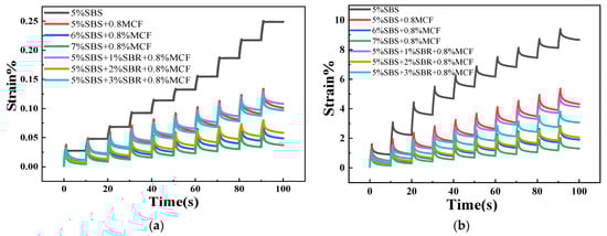 It can be seen from Figure 8 that the cumulative strain changed with time in the same way under the two stress levels, the cumulative strain increased gradually with time, and decreased with the increase of SBS content. This shows that increasing the content of SBS can improve the high-temperature deformation resistance of modified asphalt. When the SBR content increased, the accumulated strain shows a trend of first decreasing and then increasing. The accumulated strain reaches the lowest value when the SBR content is 2%. The analysis shows that the high-temperature rheological properties of asphalt can be significantly improved by SBR. The composite-modified asphalt with 5% SBS + 2% SBR + 0.8% MCF had the strongest high-temperature deformation resistance.
