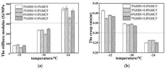 The low temperature performance indexes of the mixture with stiffness modulus S and creep rate m were obtained by BBR test. The test results are shown in Figure 9.