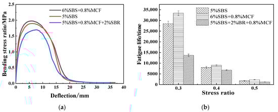 The fatigue performance of the modified asphalt mixtures was evaluated by four-point bending fatigue test in stress control mode [,,]. The bending stress-deflection curve and fatigue test results of the specimens under static load are shown in Figure 10.