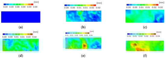 Strain cloud diagram of 6% SBS + 0.8% MCF asphalt mixture under different loading times in fatigue test. (a) loaded 0 times; (b) loaded 4000 times; (c) loaded 8000 times; (d) loaded 12,000 times; (e) loaded 16,000 times; (f) loaded 20,000 times.